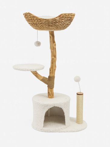 Compact, modern cat tree with a woven basket perch, plush cushions, cozy hideout, and dangling toys. Features sisal-wrapped post, natural wood look, and neutral tones to suit any home.