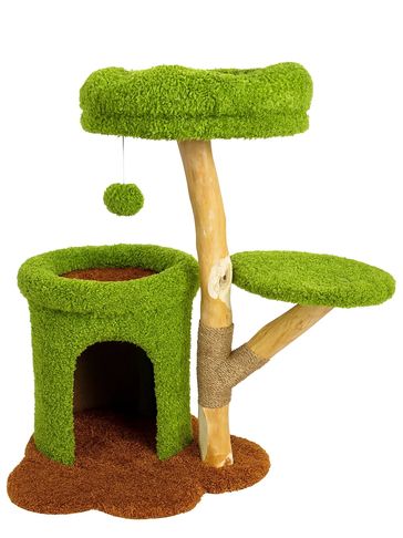 Modern tree-shaped cat tower with plush green carpet, cozy cave, elevated perch, and hanging toy. Features sisal-wrapped posts, soft resting spots, and multi-level fun for active, comfy cats.