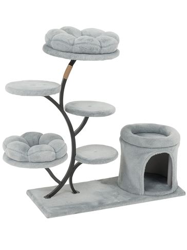 Chic flower-themed cat tree with plush grey perches, sleek black stems, and a cozy base hideout. Features five levels for climbing and lounging, soft velvet-like surfaces, and a stable, floor-safe design.