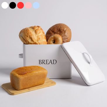 This extra-large bread box features both a sleek metal lid and a bamboo lid that doubles as a cutting board. Spacious enough for two loaves or pastries, it keeps bread fresh and countertops clutter-free. Includes a reusable cotton bread bag and arrives gift-ready—perfect for modern or farmhouse kitchens.