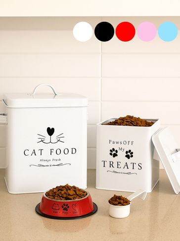 Includes a large metal Cat Food Bin (fits 5–7 lbs), a matching Treats Container (fits up to 2.25 lbs), a handy Food Scoop, and a glossy red Pet Food Bowl. Made from durable powder-coated steel with tight-fitting lids to keep food fresh and safe – no more plastic containers! Stylish farmhouse design, eco-friendly, and comes in a premium gift box – perfect for cat lovers and their furry companions.