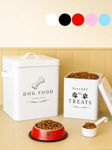 Includes a spacious Dog Food Bin (fits 5–7 lbs), a Treats Container (up to 2.25 lbs), a Food Scoop, and a glossy red Food Bowl for dry or wet food. Made from powder-coated steel with airtight lids to keep food fresh and pest-free. A stylish, plastic-free solution with a farmhouse charm, packed in a premium gift box.