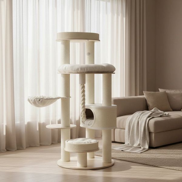Designed for multi-cat households, this tall, vertically structured cat tree is crafted from solid natural wood and creates layered play, rest, and observation zones within a balanced footprint. Multiple plush platforms, an enclosed hideaway, and a soft hammock offer varied spaces that allow cats to share the structure comfortably without crowding.